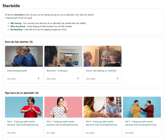 Startsiden i Glup er det første du møter når du logger inn på læringsplattformen. Her får du en rask oversikt over din kursstatus.